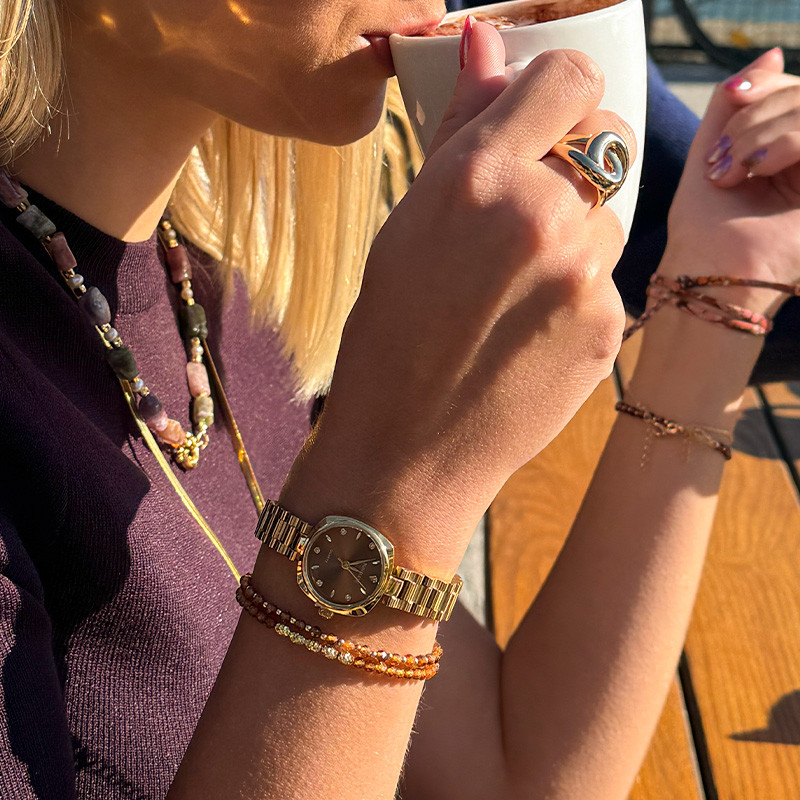 Son bracelet doré au fini brillant s’accorde parfaitement à la teinte chaude du cadran, créant un contraste harmonieux et sophistiqué.