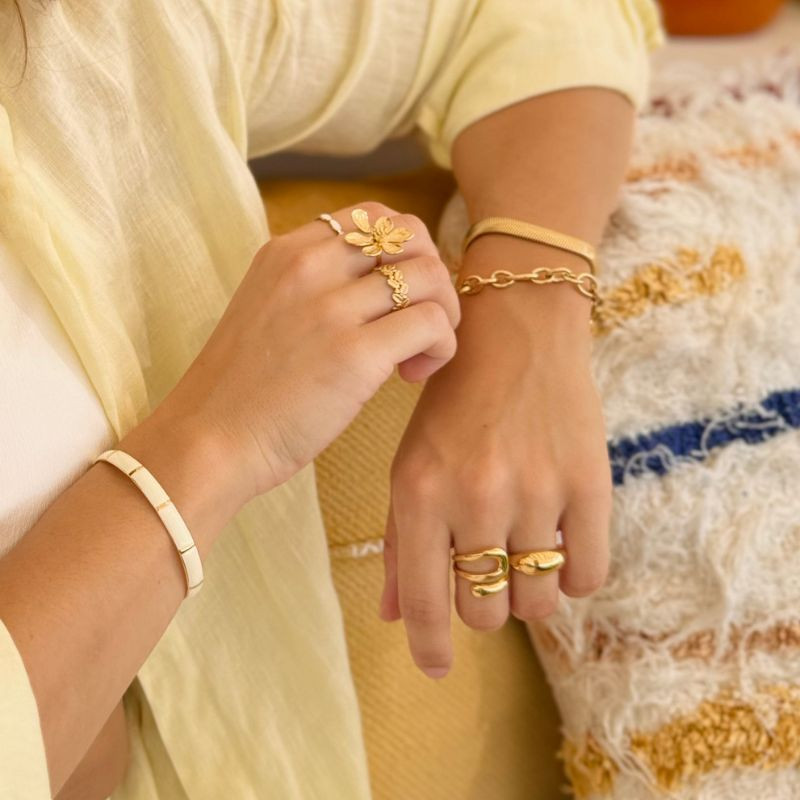 Pour un total look, cette bague pâquerette peut se compléter avec nos bracelets, nos colliers et nos boucles d'oreilles en acier et plaqué or.