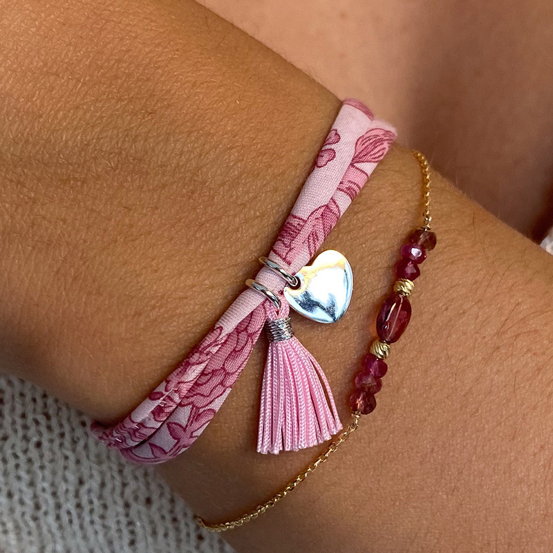 Bracelet Liberty rose et son pendentif coeur argenté et pompon rose pâle.