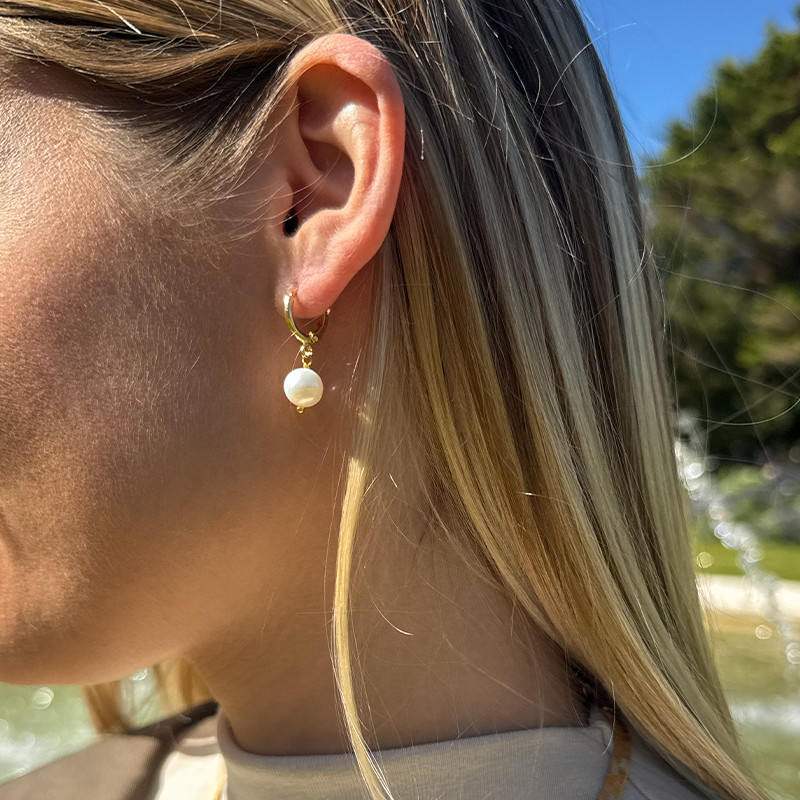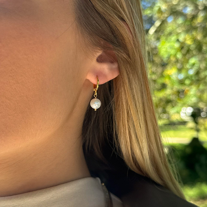 La créole fine épouse délicatement le lobe, tandis que la perle suspendue apporte du mouvement et de la douceur. Chaque perle, unique par sa forme et son éclat, reflète la lumière avec subtilité.