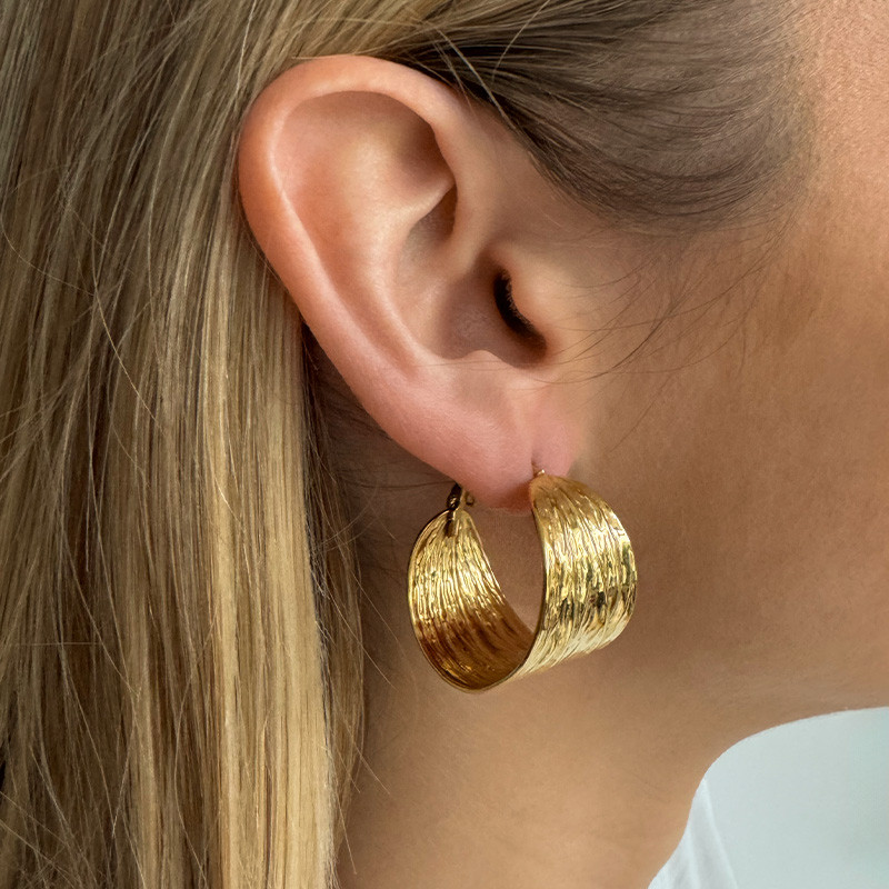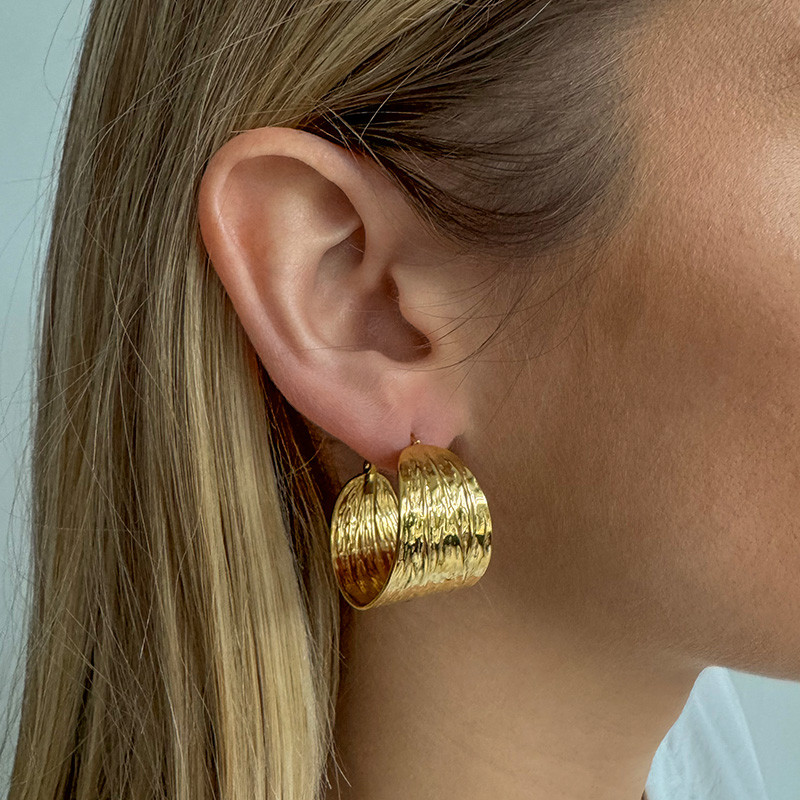 Créoles épaisses en acier doré avec une texture froissée raffinée. Un bijou tendance à la finition lumineuse et originale.