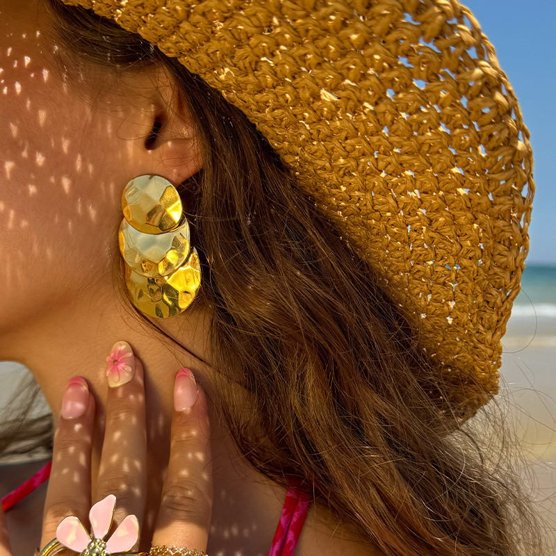 Ajoutez une touche de caractère à votre style avec nos boucles d’oreilles dorées en acier inoxydable, composées de trois disques martelés superposés.