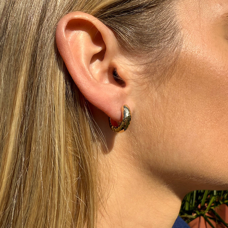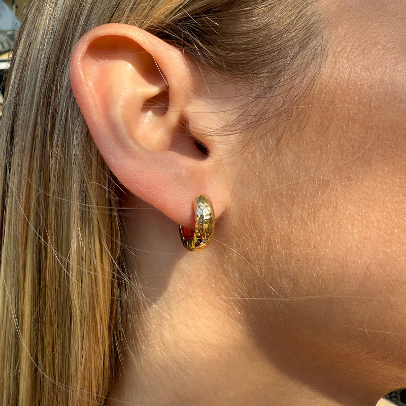 Créoles en plaqué or martelé, élégantes et lumineuses. Un bijou tendance et intemporel, parfait pour illuminer toutes vos tenues.