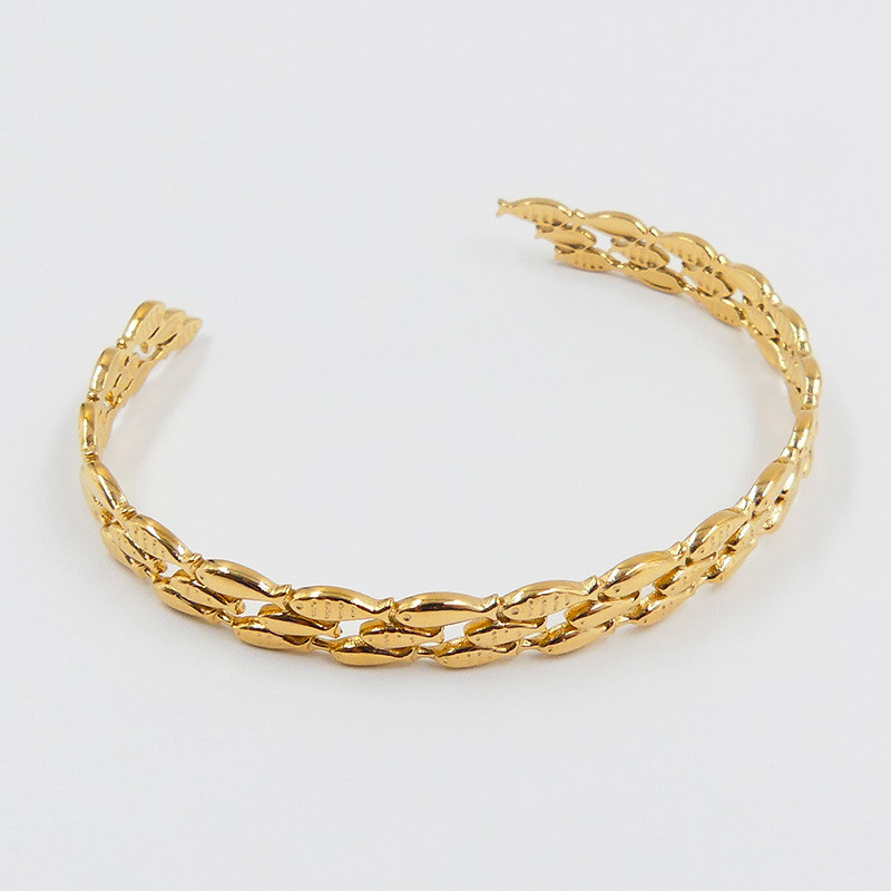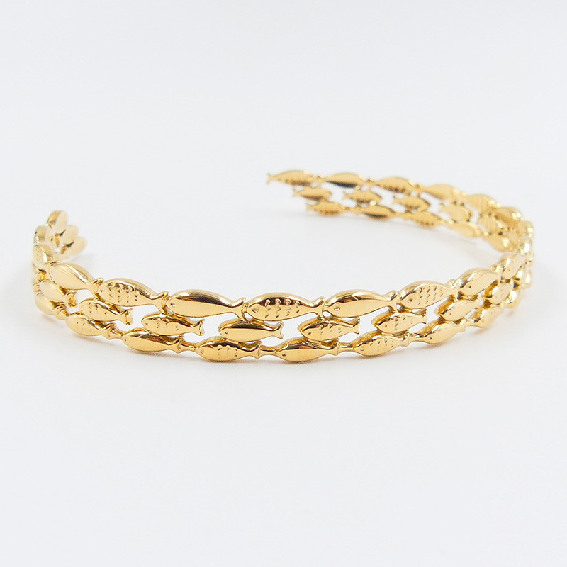 Jonc en acier doré ajustable, délicatement décoré d’un motif poisson. Un bijou tendance et raffiné, facile à porter et parfait pour toutes les occasions.