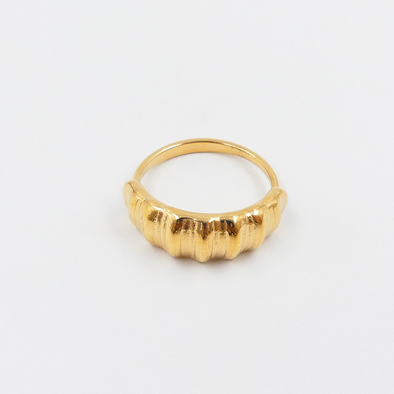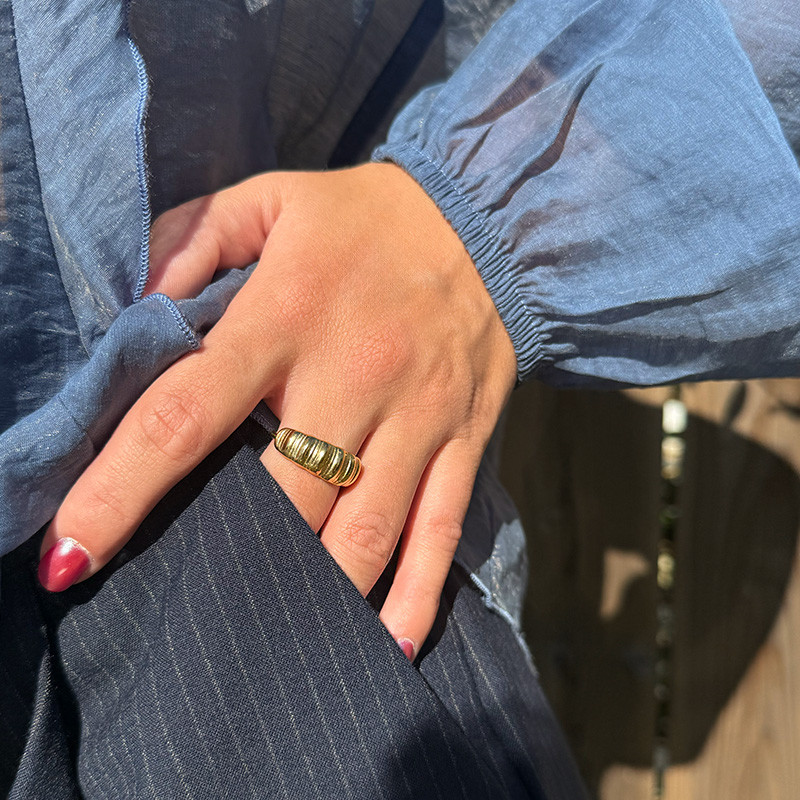 Cette bague en acier doré séduit par son design raffiné et son motif matelassé en relief, inspiré des tendances intemporelles de la haute couture.