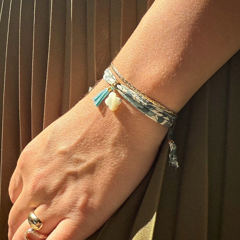 Son motif fleuri Liberty apporte une note de fraîcheur et d’originalité, tandis que le trèfle en nacre, symbole de chance et de douceur, illumine le poignet avec élégance.