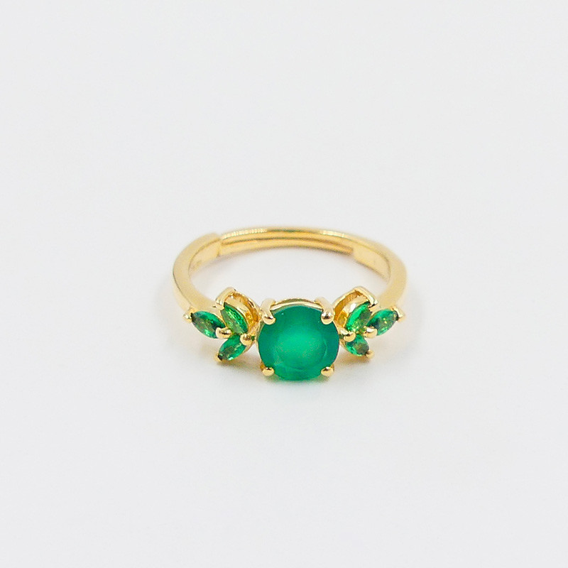 Bague dorée ajustable ornée d’un rond central en onyx vert et de trois feuilles en onyx vert de chaque côté.