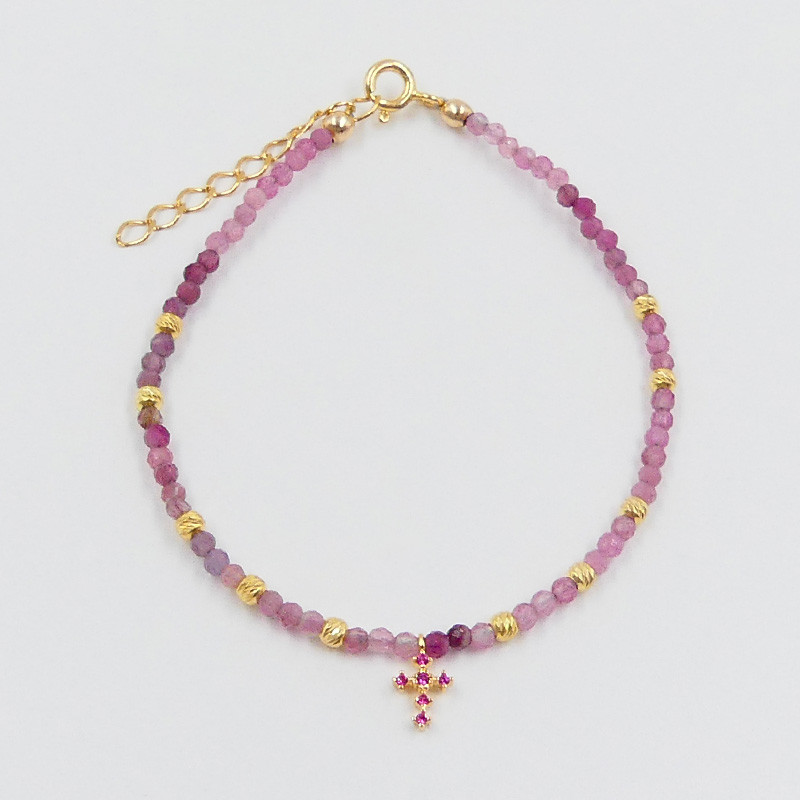 Bracelet doré élégant, orné de pierres naturelles de tourmaline rose et d’un pendentif croix rose au centre.
