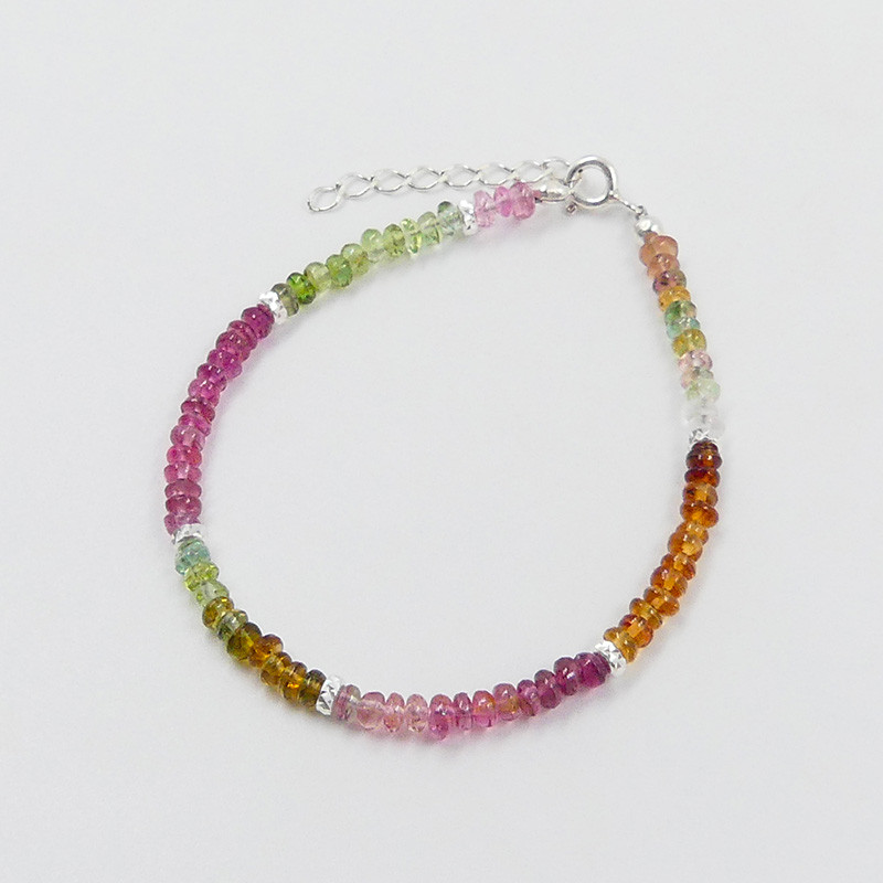 Bracelet en argent 925 orné de tourmalines en dégradé, séparées par de fines perles argent. Un bijou coloré, délicat et raffiné.