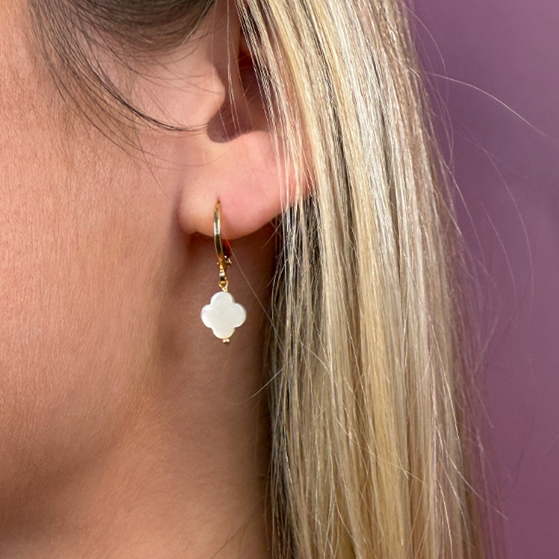 Ces petites boucles pendantes sont composées d'une créole dorée à laquelle est accroché un petit trèfle nacre.
